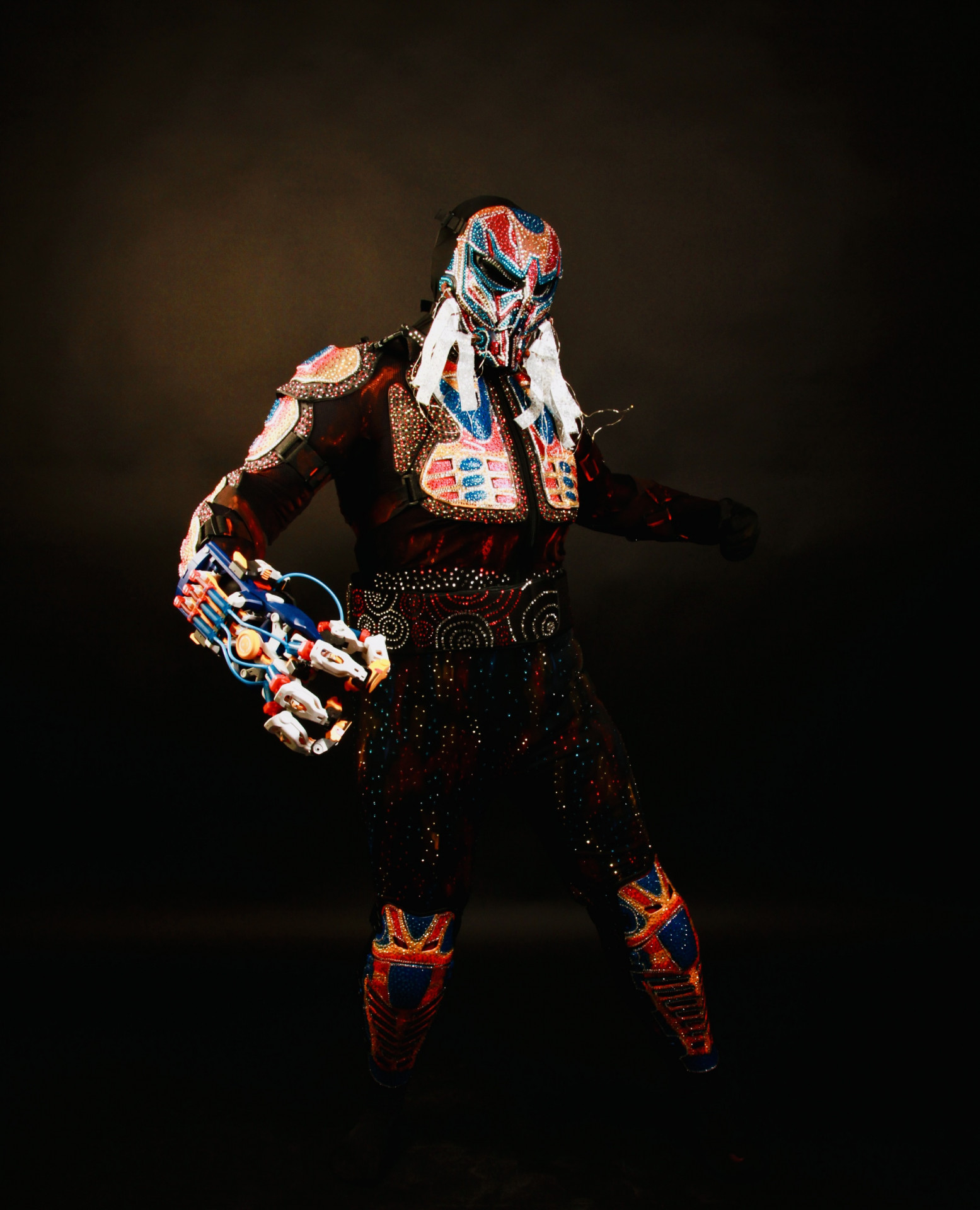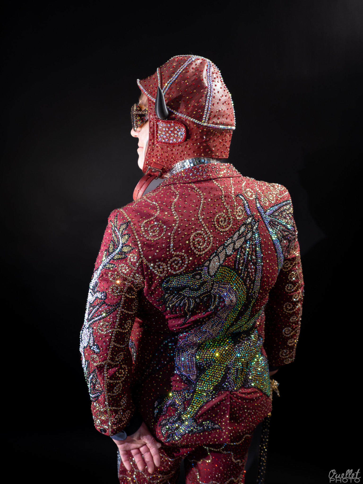 Each of my pieces is an individual work of art and I spend hundreds of hours designing and rhinestoneing them. Recently I have started incorporating modeling materials to give them more shape and make them avant-guard. I’m always pushing myself to add more material and more rhinestones