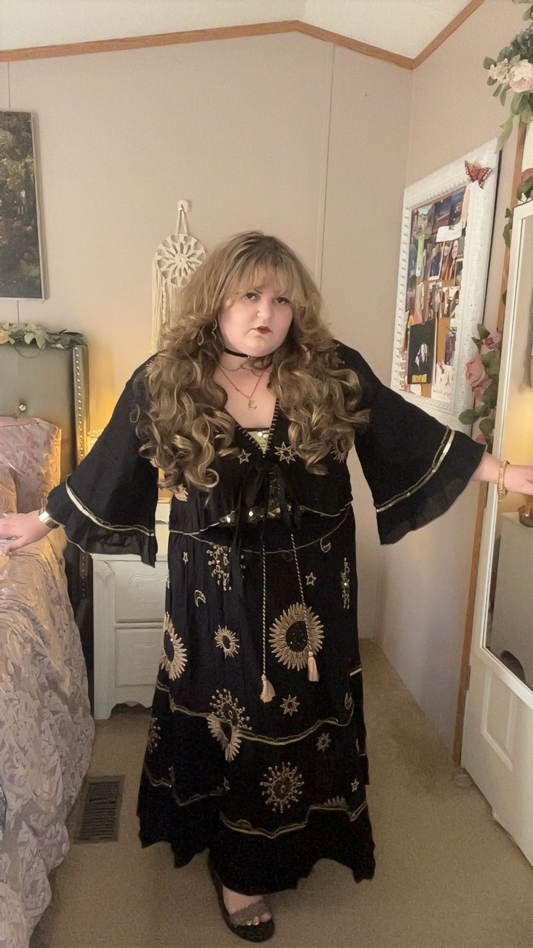I blend vintage fashion and my own modern flair. I emphasize matching details and usually highlight statement pieces. The 1960s and 1970s captured my heart and left me wanting more. I live for a bell sleeve, big hair, heavy eyeliner, and shiny accessories to compliment my looks.