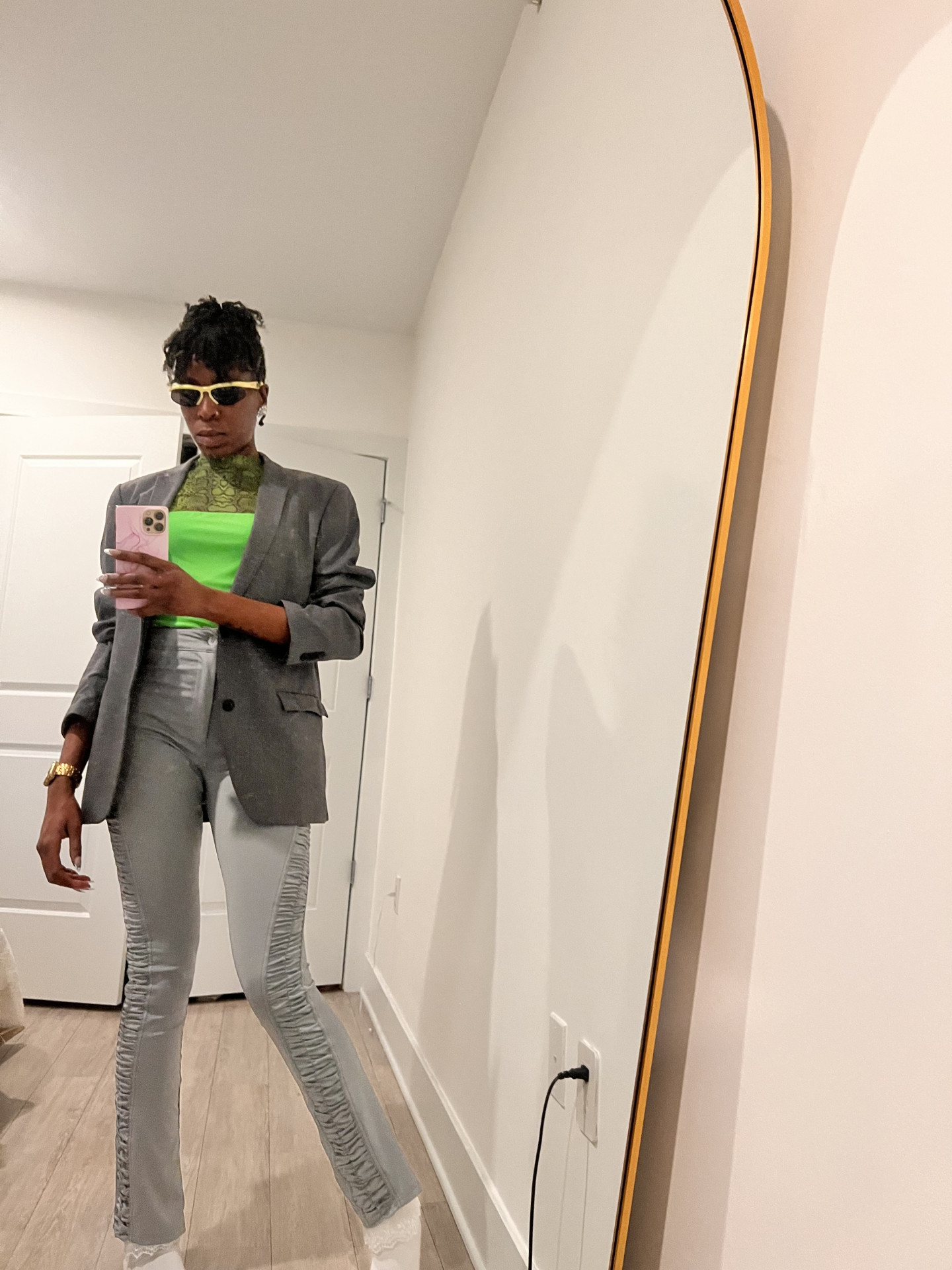 My style commands attention through fearless boldness—whether I’m at dinner or a grocery run, I make a statement and turn heads. Every day brings something new—streetwear meets preppy, chic meets edgy, textures collide, and flare ties it all together. Paired with confidence and aura, my style is a movement that inspires smiles and sparks creativity because it’s more than just fashion; it’s energy!