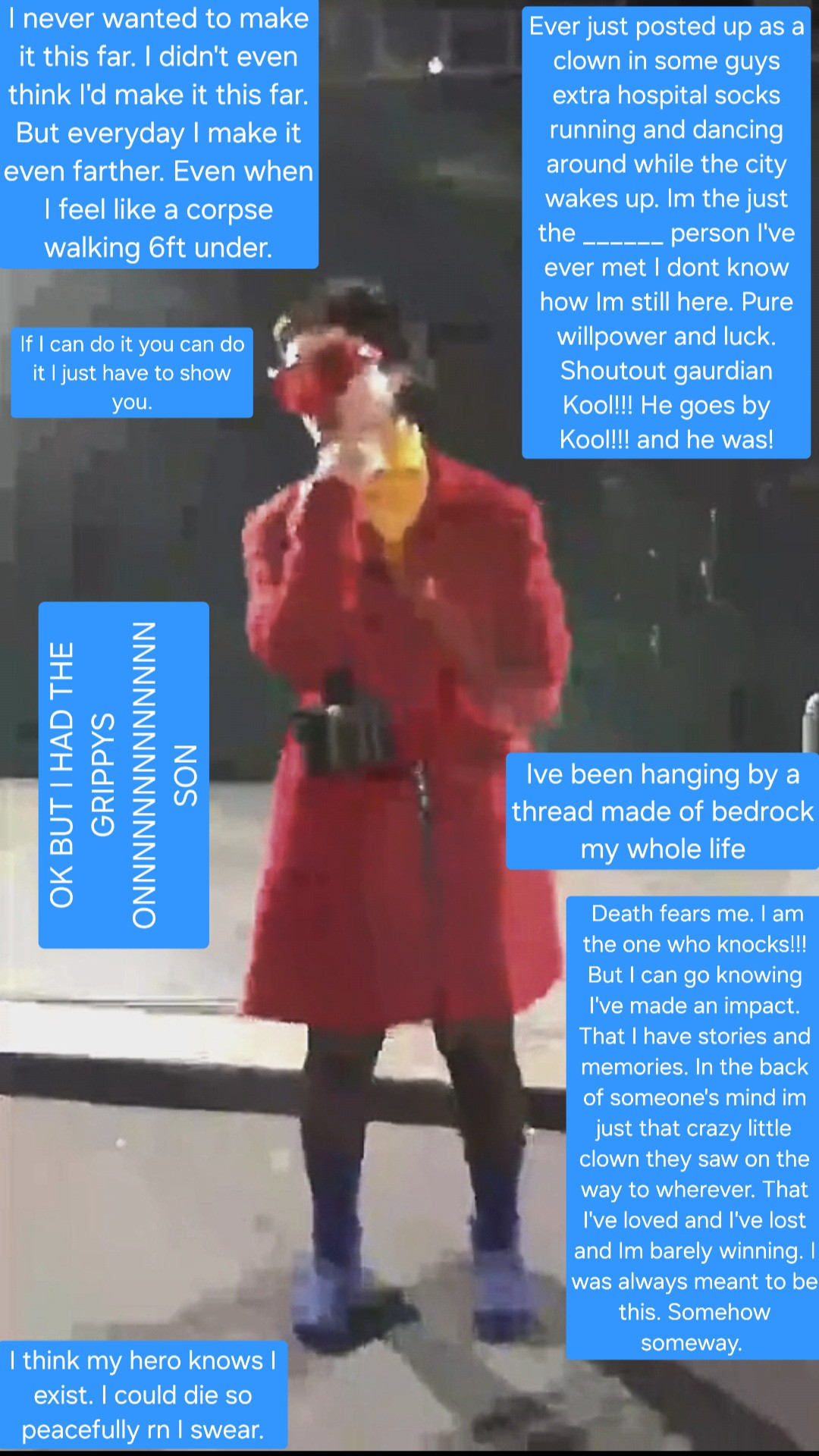 First thing, pay off my grandma's $3k credit debt. Put a down payment on a van to live in my van and get away from my weirdo roommate I found on craigslist. Some dude. Give to local charities in town. Care packages to homeless. Travel and be a motivational speaker for children speaking at schools. And just for everyone in general. A decent microphone/ speaker to busk in towns. Take daycare kids on feild trips. Invest in clowning, in community. Take EJ & Bernie to lunch!
