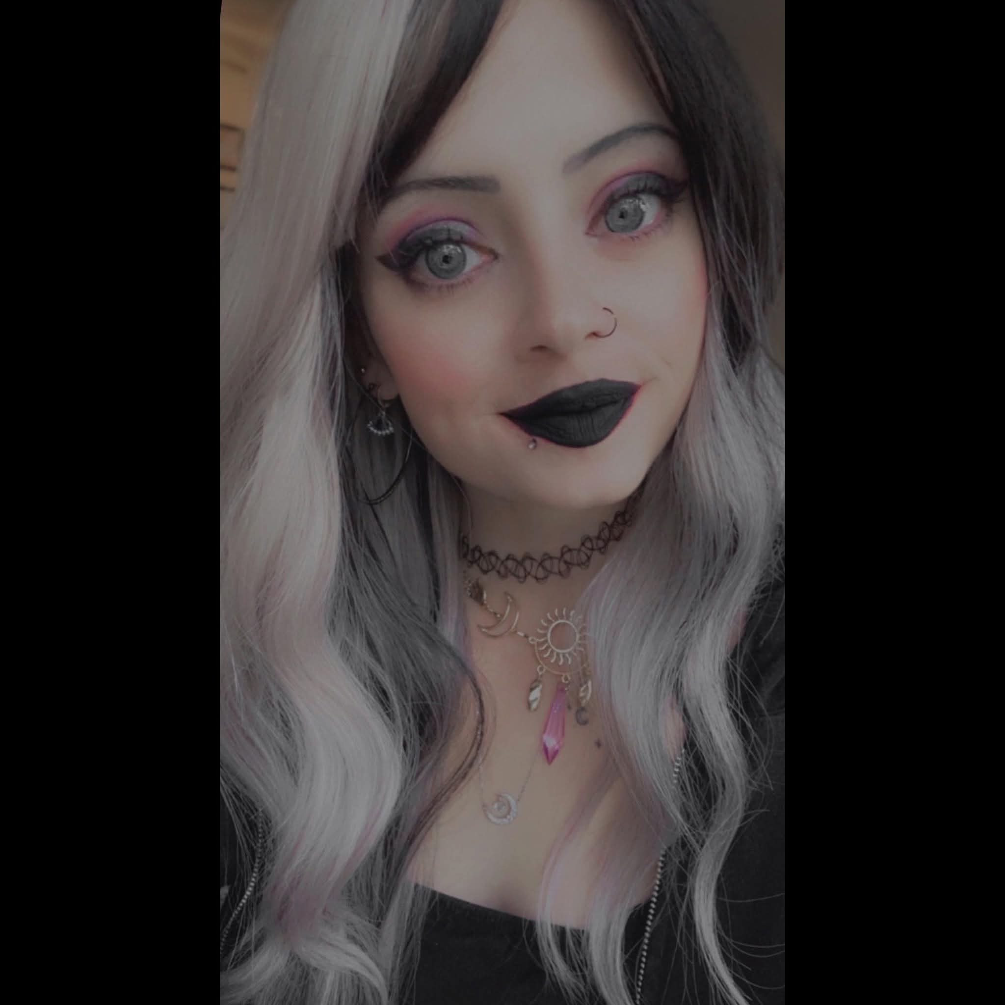 I'm standing in the ruins of a gothic cathedral at twilight, wearing a floor-length black velvet gown with corset lacing, exaggerated shoulders, and cascading lace sleeves. A sheer veil trails behind me, catching the wind like smoke. My boots are heeled, leather, and spiked. Heavy silver jewelry glints against my pale skin — rings like relics, a serpent-shaped choker, and claw-like cuffs. Black lipstick, kohl eyes, and a stare that silences time. The world feels haunted, I am it's high priestess