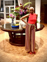 I'm told I am theatrical, funky as well as elegant, at any given time. I dress for colors I am feeling, my mood and the event. Time of day does not matter. I say wear glitter and rhinstones when you want. Life is to be lived, Fashion is to be seen.