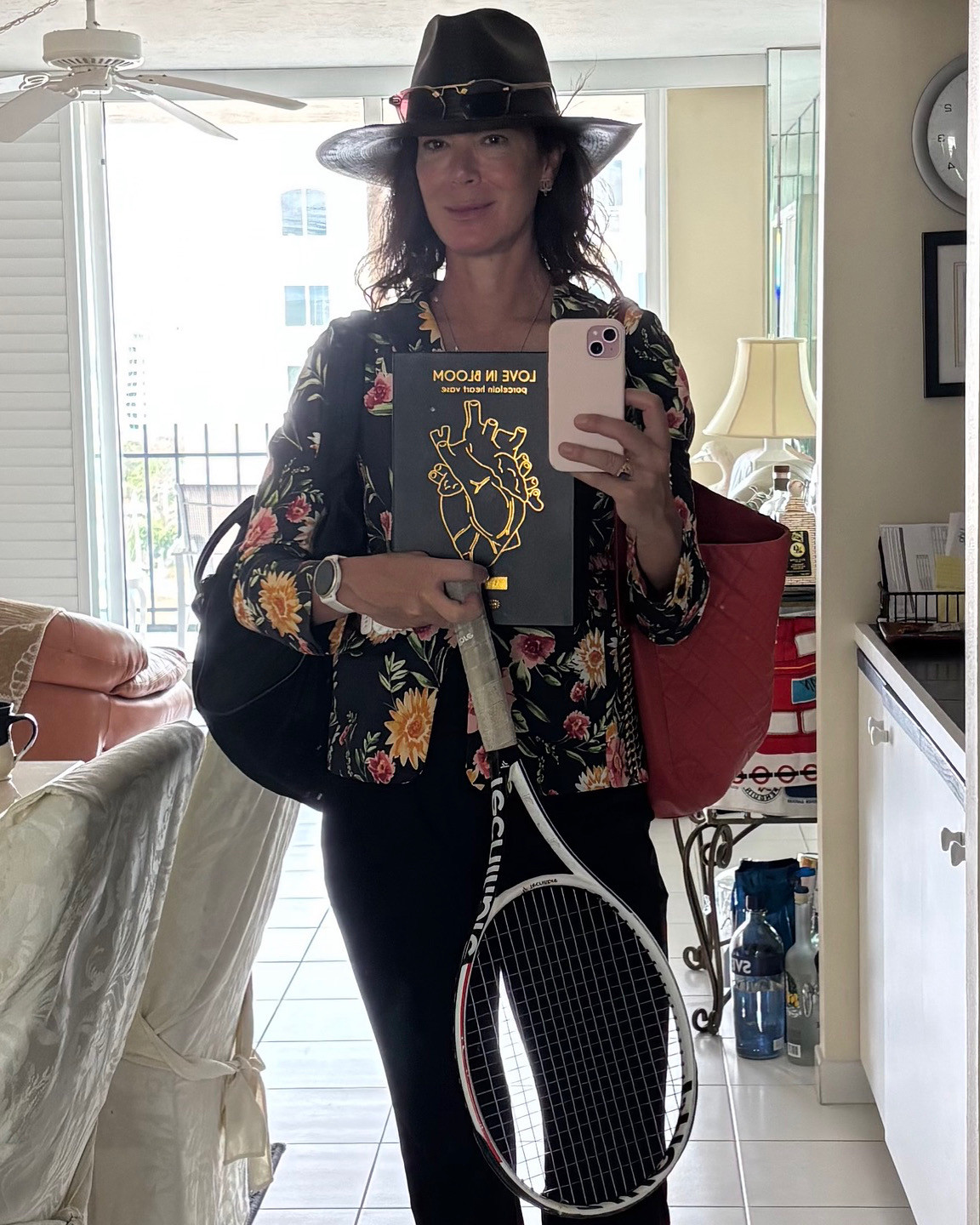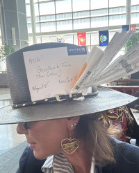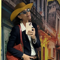 I absolutely love hats. I add special momentos to them where they start to tell a story about my day or what I am in to. I think hats naturally give you an unexpected edge. I dress how I feel and have an eye for pattern and color. I like to mix and match patterns, belts, glasses, bags, and sometimes put things together that might not look like they should work but they generally do. Color and hue or a certain thread connects it all together. Smile and heart connect it ALL together