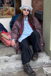 I feel like a modern Cass Elliot when I dress up. Most of those photos are of me from while I was homeless. I found all the clothes in dumpsters I styled them. The Yale girls took influence and bought stuff just like it. It is very androgynous. I manage to make a poncho look badass. Not a lot of people who have my body dress like this.