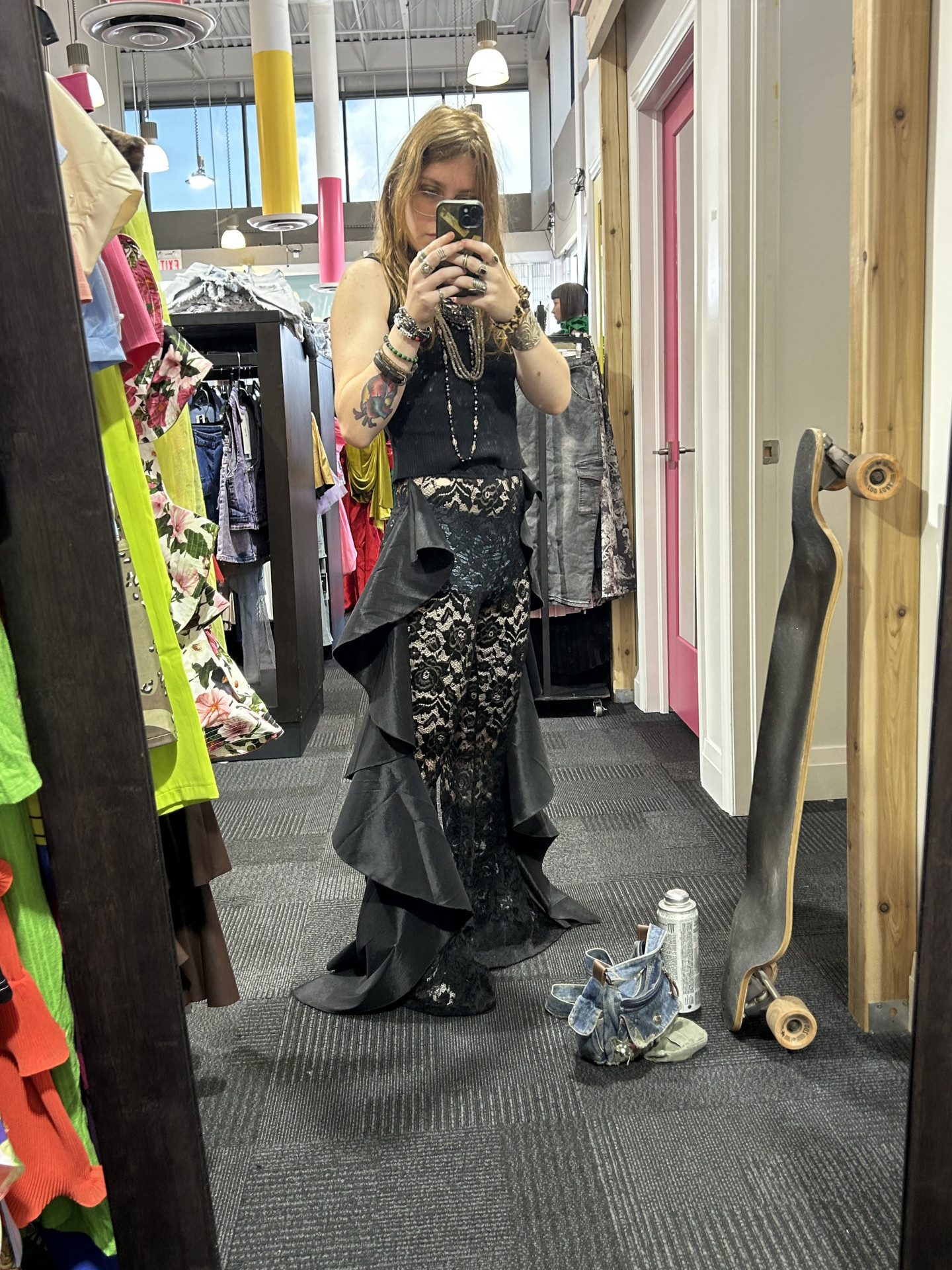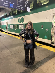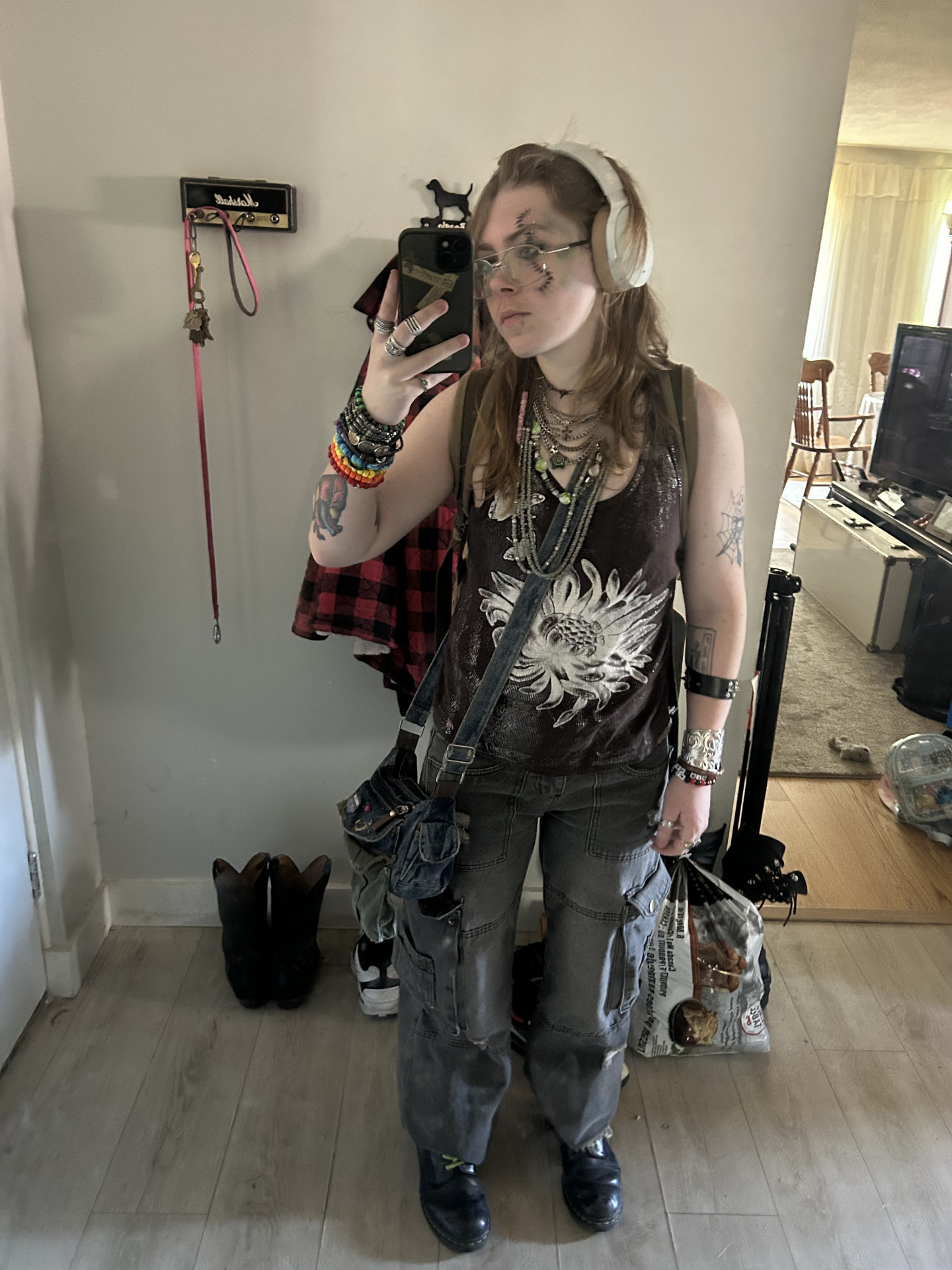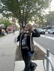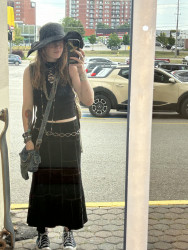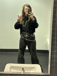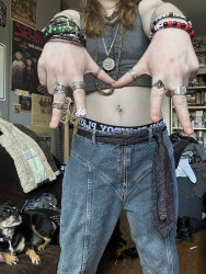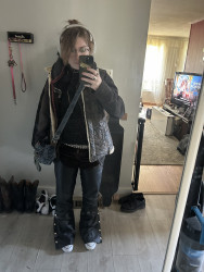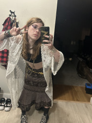 I am heavily inspired by my local alternative music scene, old fashioned rock stars, and spirituality. I like to look witchy and I ALWAYS have to add a whole bunch of accessories, like shiny things. I wear a lot of silver to accentuate the dark/muted colours I tend to style with. I also EXCLUSIVELY buy my clothes secondhand or from very cheap places (eg. Walmart). I just love to present my creativity on myself in the form of fashion, makeup, tattoos and piercings!