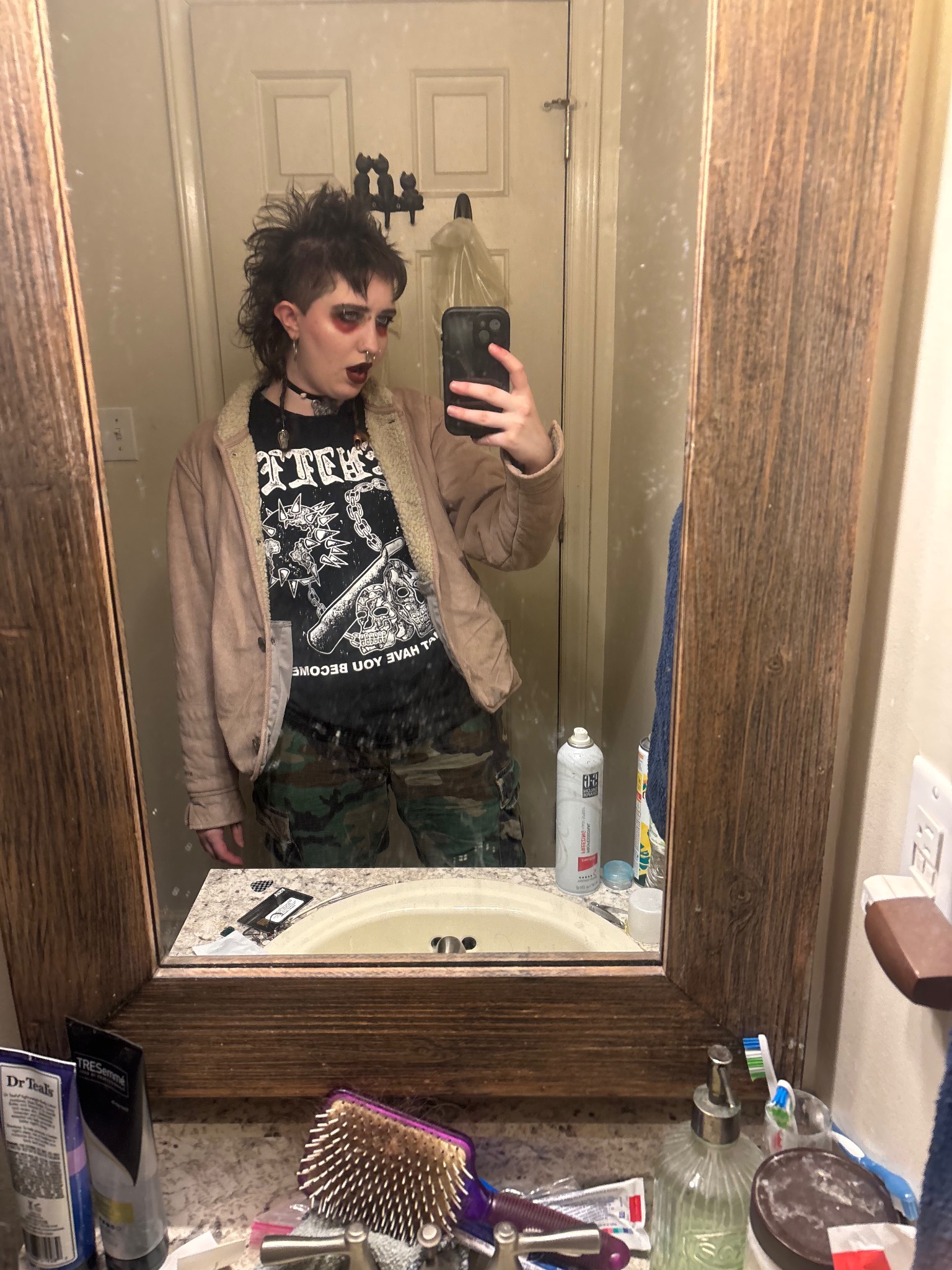 Punks are few and far between here in the south. Outside of the hardcore scene, I often get side eyed by strangers in public. In a sea of Simply Southern and Patagonia, enter Jett— a queer gender gremlin with an 8 gauge septum piercing, stick and pokes, JNCO jeans, and Doc Martens.