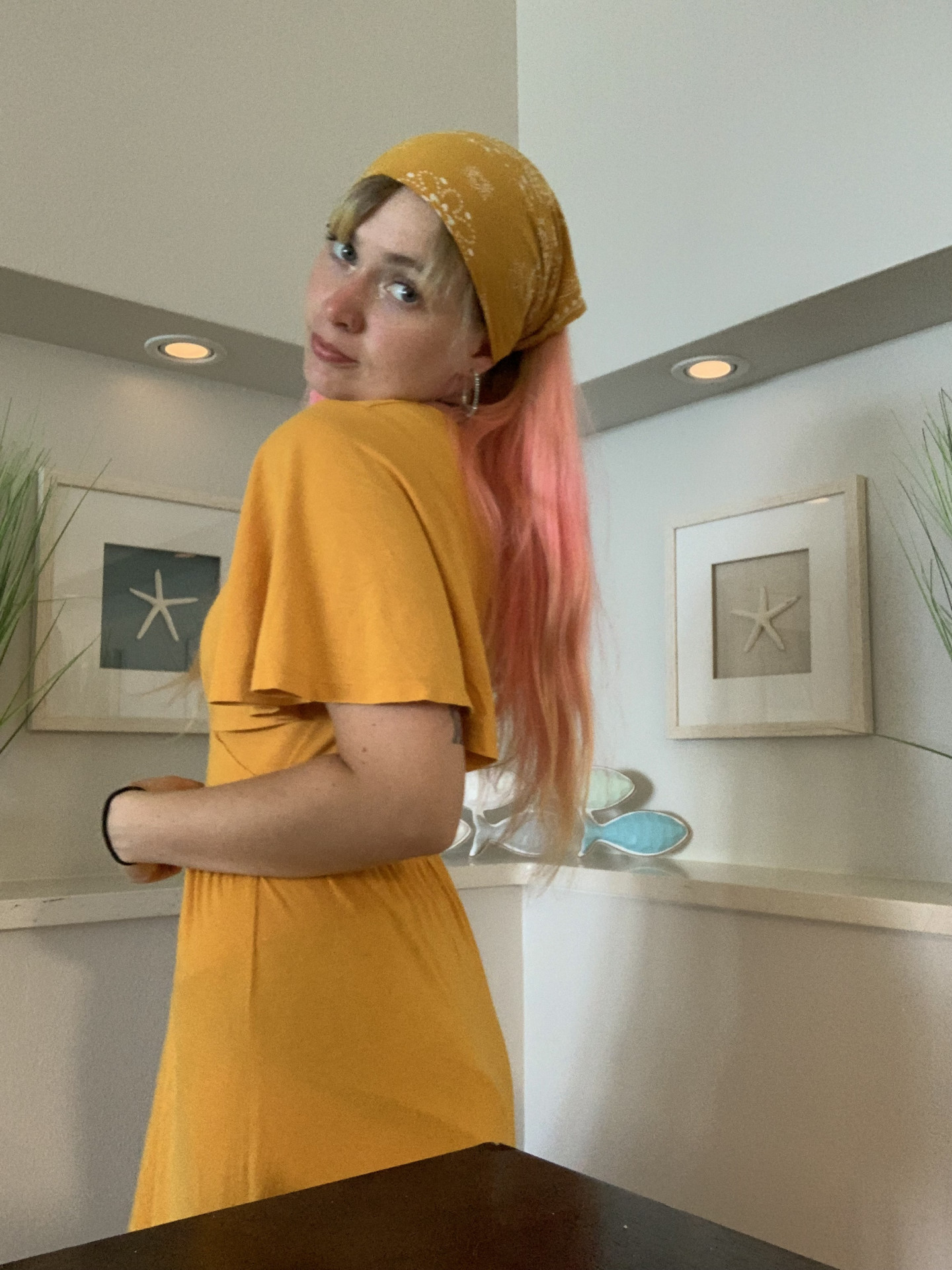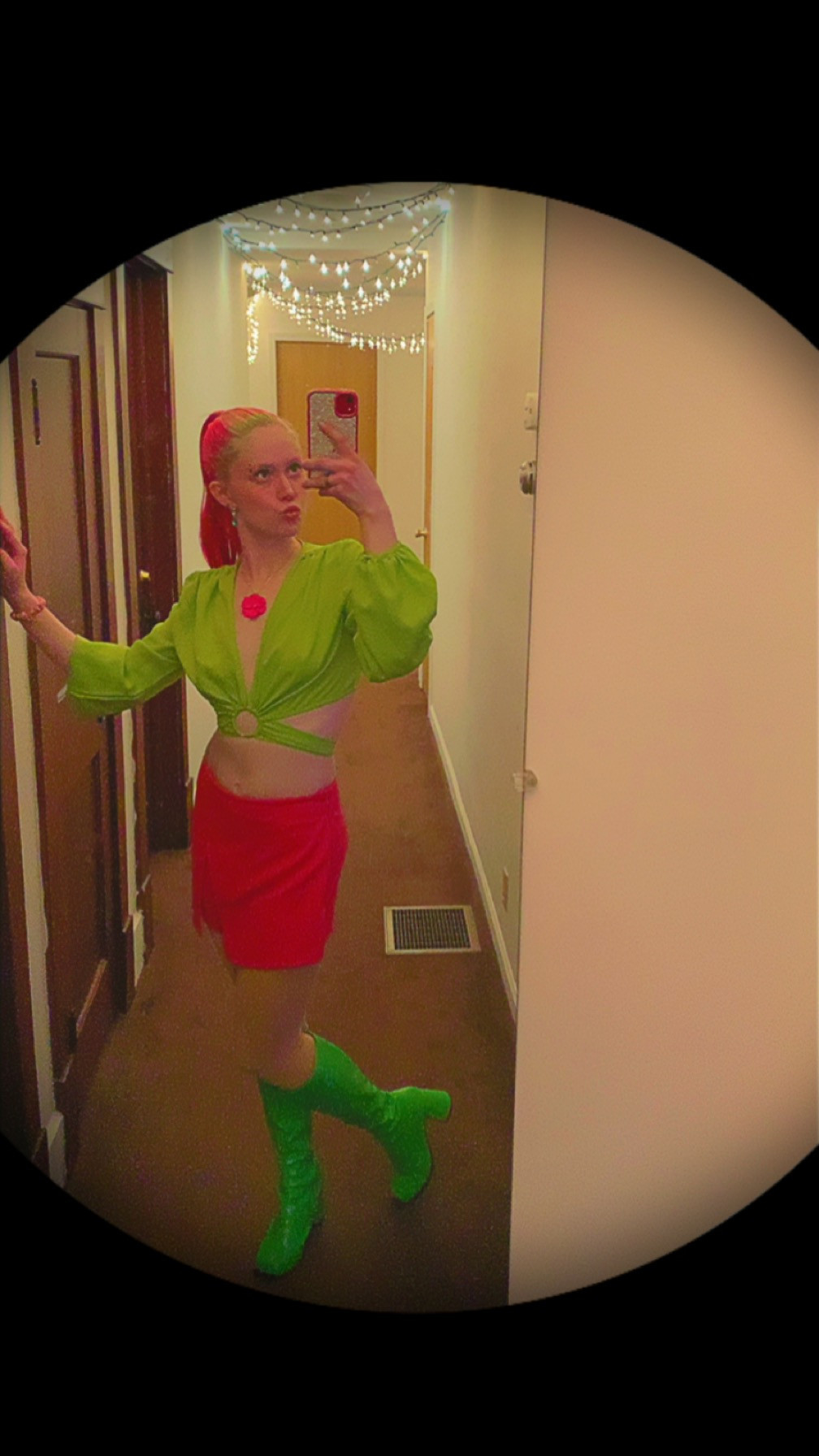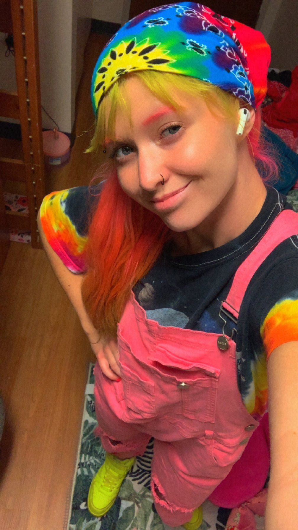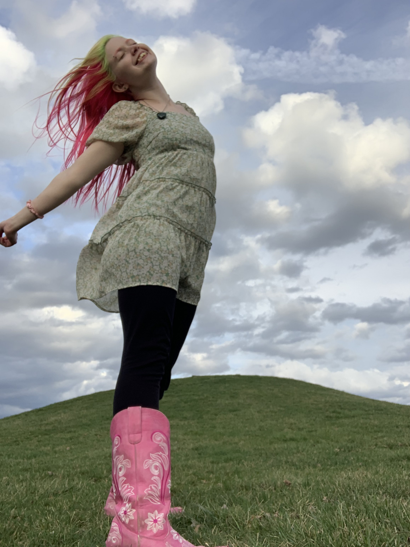 My style is very colorful and hard to miss. My hair has been pink and green for 4 years. Most of my wardrobe is neon pink and green. People often know me as the pink lady! I will get lots of wonderful compliments and I catch people’s eye. I don’t always wear pink and green, but my clothes will always match. I am a colored-coded girly. I also wear lots of sparkly 70s clothes!