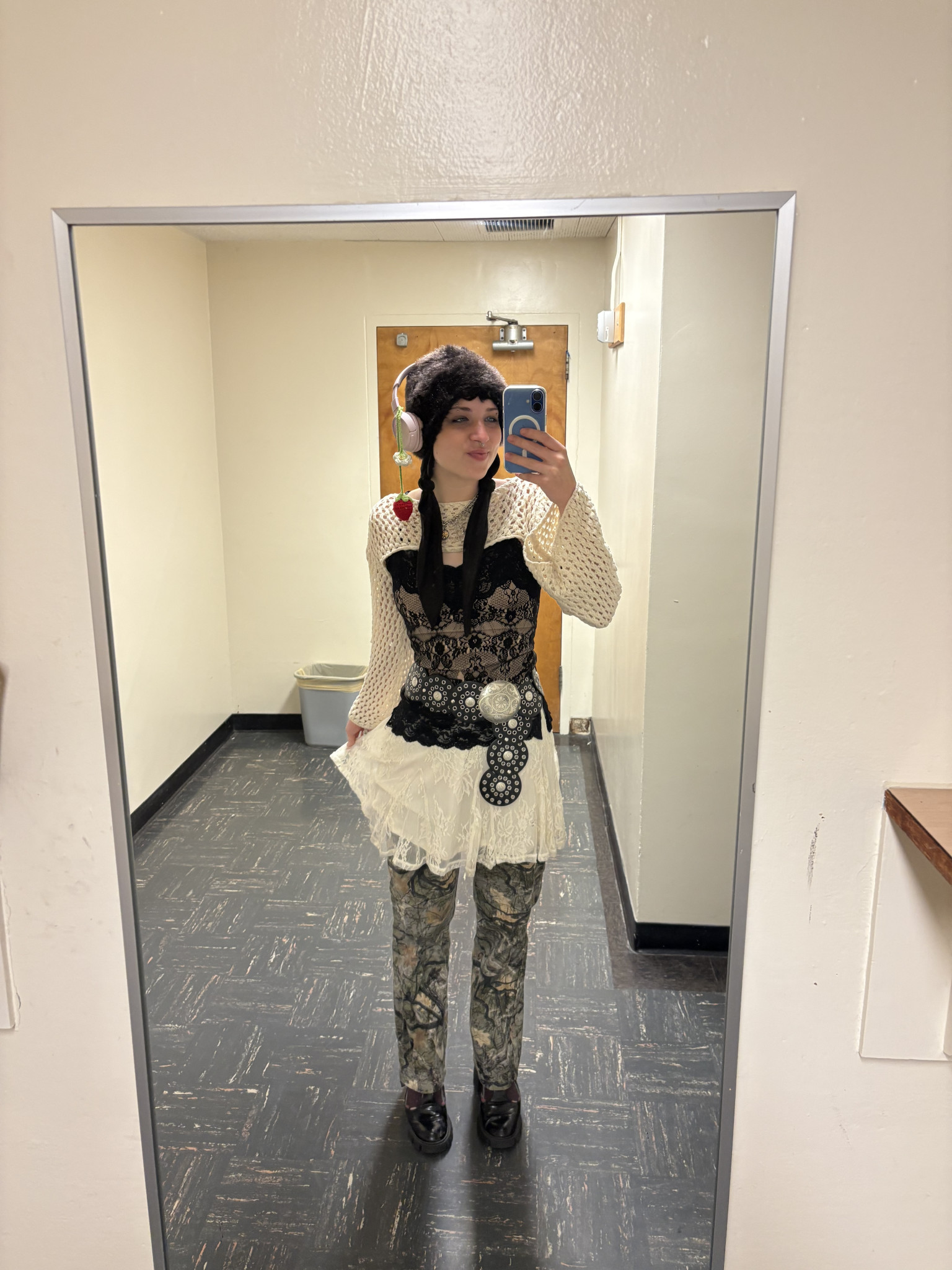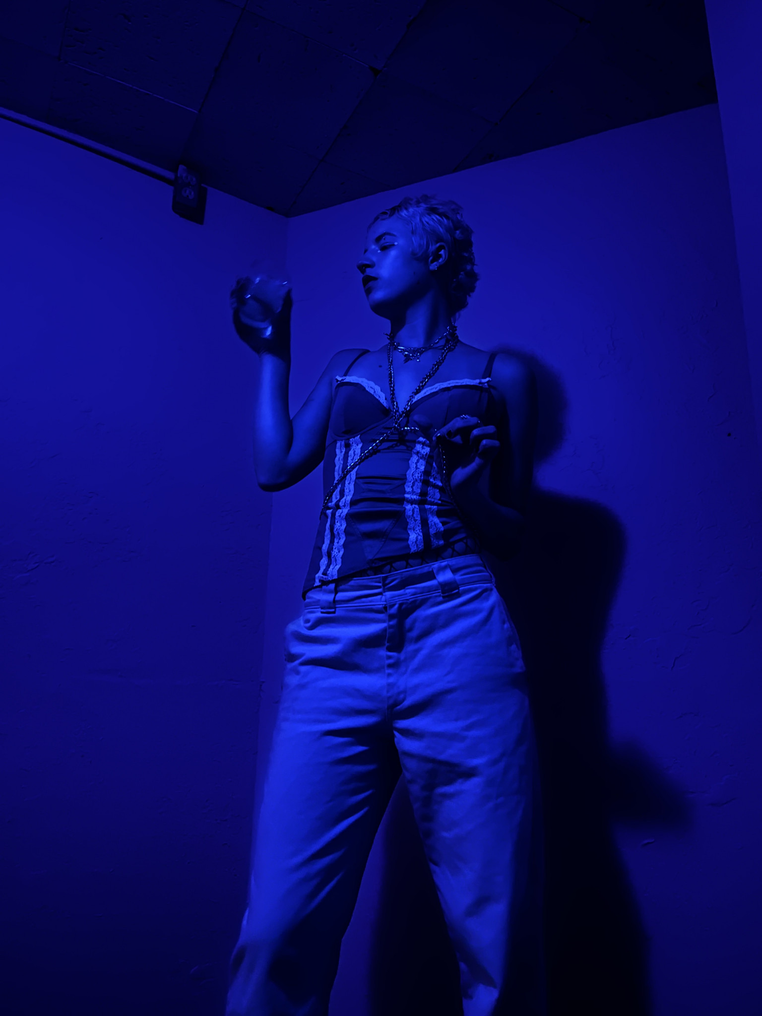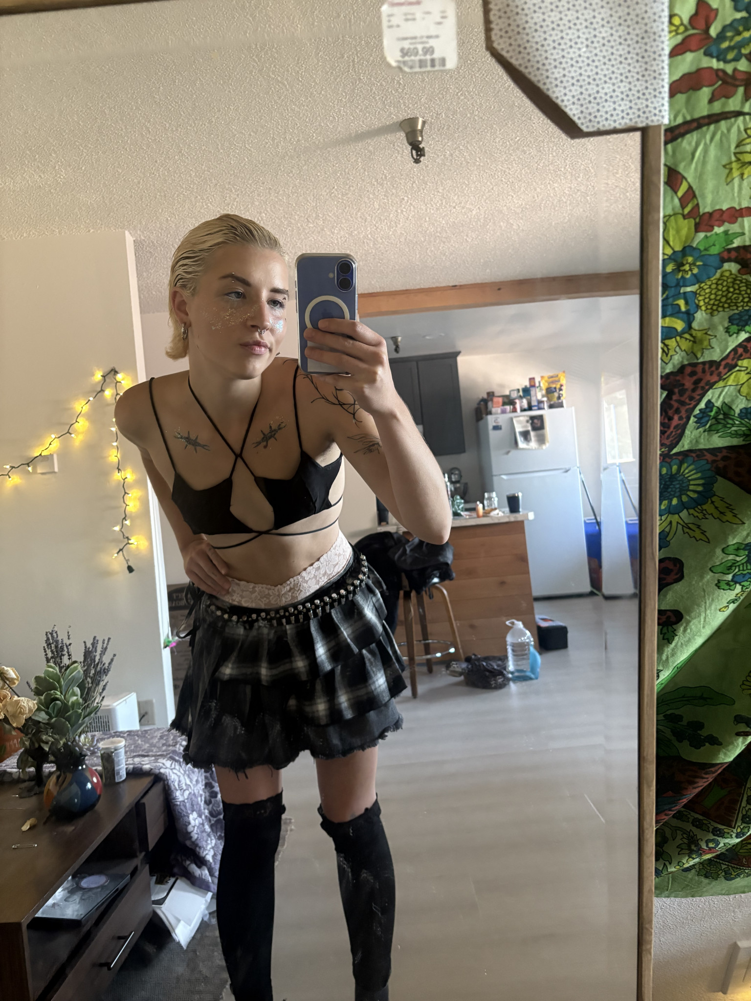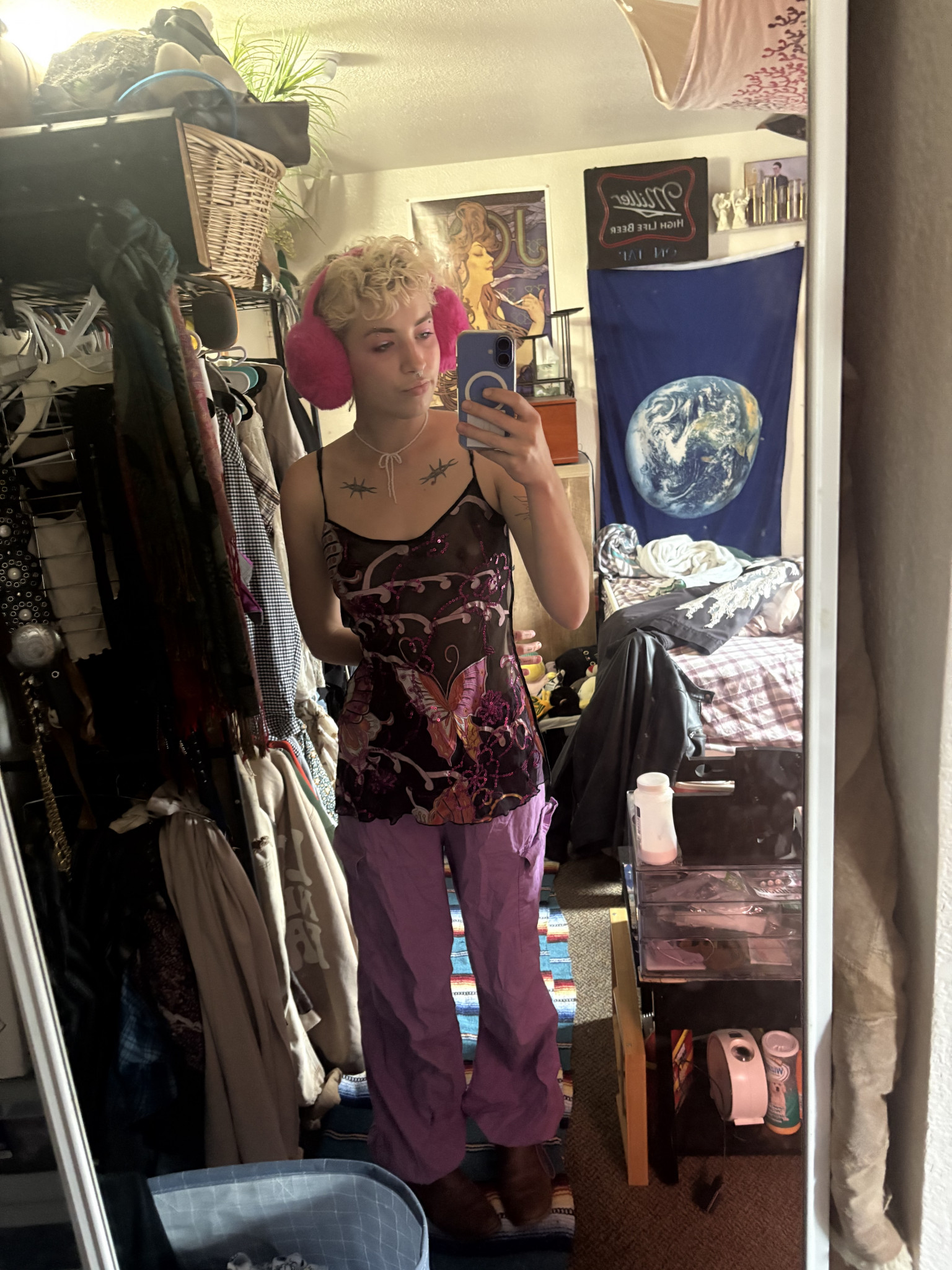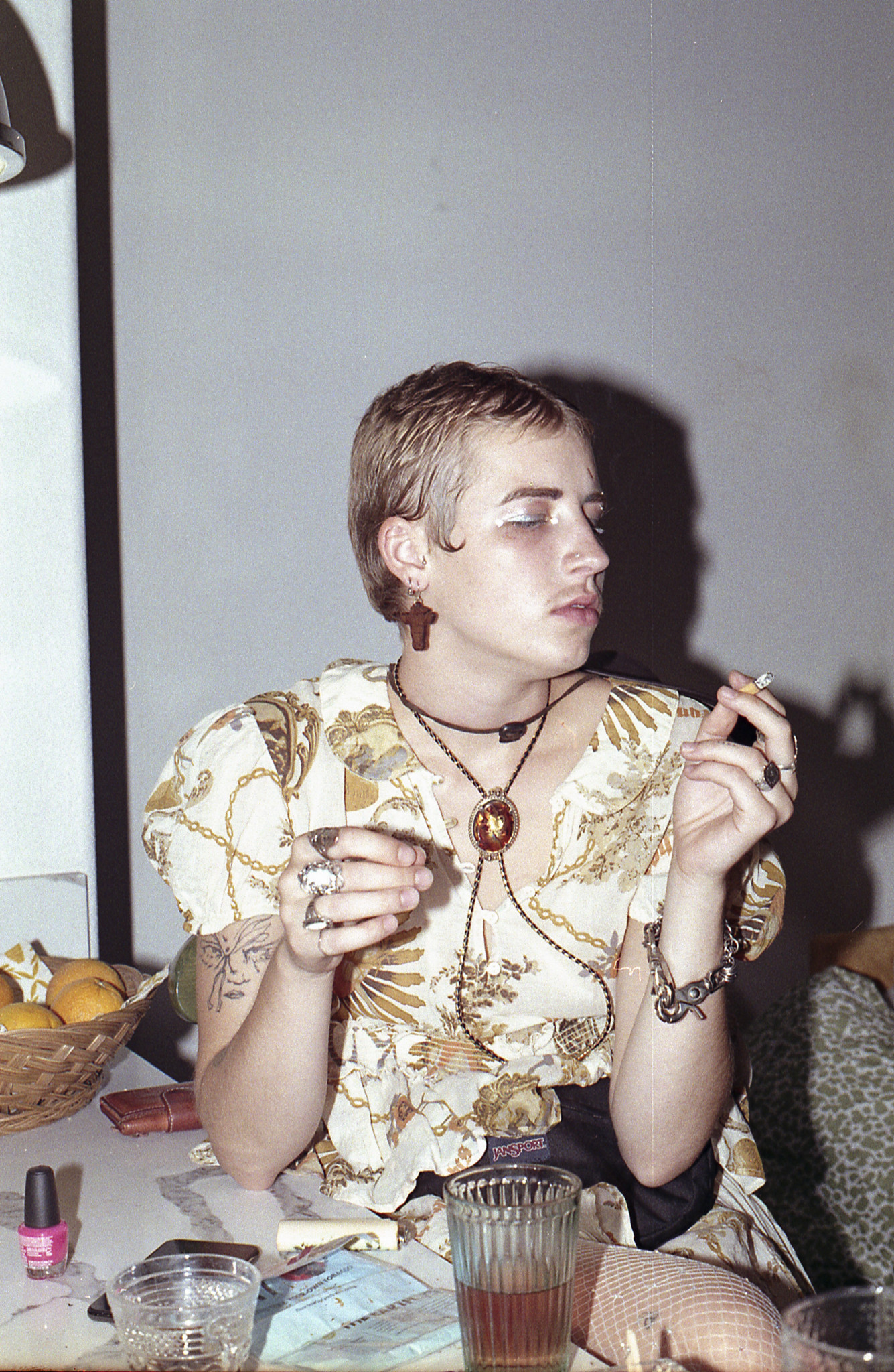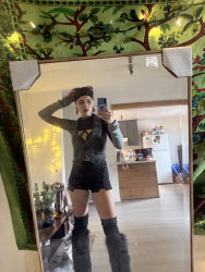 Being non-binary the fluidity of my fashion is dependent on my mood, my clothing options, but never the weather. My closet consists of what I find at my local thrift shops or friends clothing swaps. I wear shirts in layers, a skirt over jeans, and accentuate the look with make-up always some freckles of glitter.