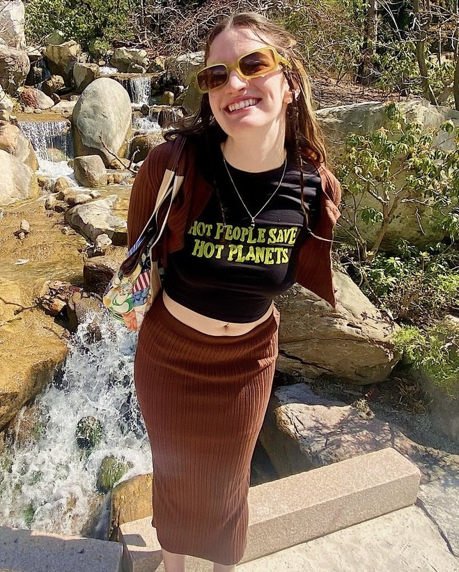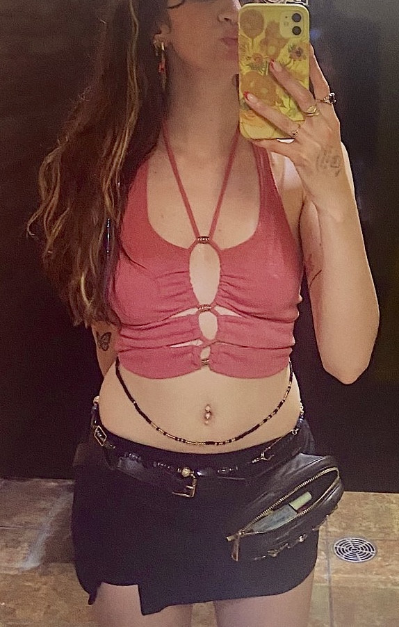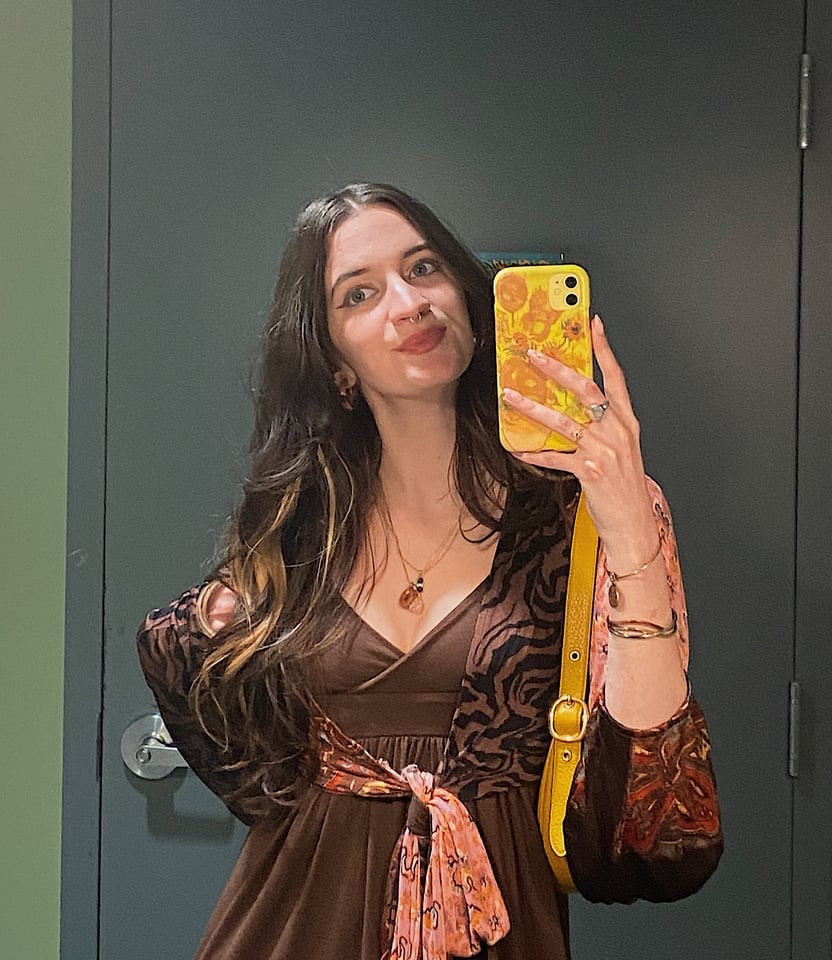I only buy clothing secondhand either at thrift stores or online shops like Depop or Thredup. It is cheap and environmentally friendly, but it also allows me to source unique, stand out pieces! I love styling the pieces that make you go, “what would I even wear this with?” I see it as a fun challenge and art method. Just like when I create a mixed media painting, styling allows me to mix textures, colors, and patterns in unexpected ways that draw the viewer in. My style is fluid and fun!