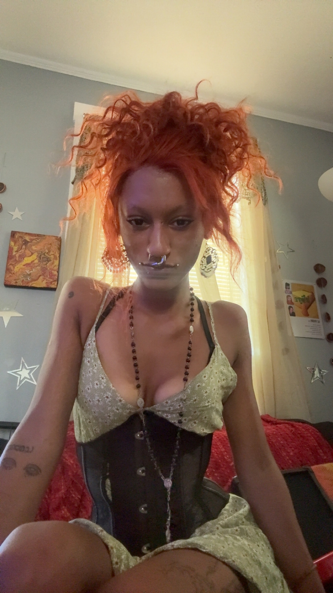 If I had the money to commission a small designer or seamstress, I’d love a beautiful evening gown almost fully mesh except the bottom, mermaid long sleeve ,a slightly corseted bodice, and the only parts not visible are covered in studs and jewels, a nice silky black bottom that flows and billows. With editorial makeup and a large grungy updo. I like a dramatic exaggerated silhouette especially that accentuates my figure.